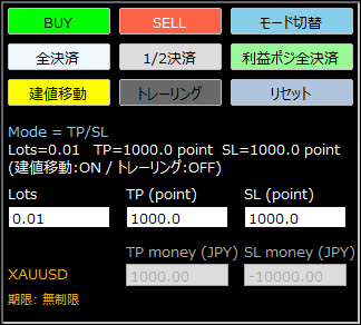 - TP/SL:ポイント、または金額ベースの初期値を設定