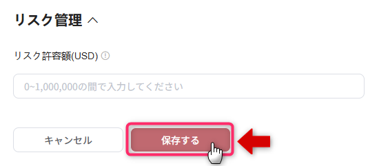 例:1,000ドル入金 → 500ドル損失で停止したい場合は「500」と入力。