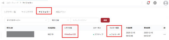 シグナル名「WhiteBearX2B」を検索し、「フォローする」をクリックします。