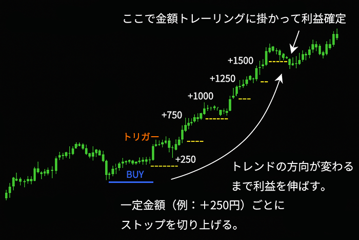 金額トレーリングは、レートではなく口座通貨の損益額で最大利益を記録し、一定の戻り幅が出たら決済する仕組みです。